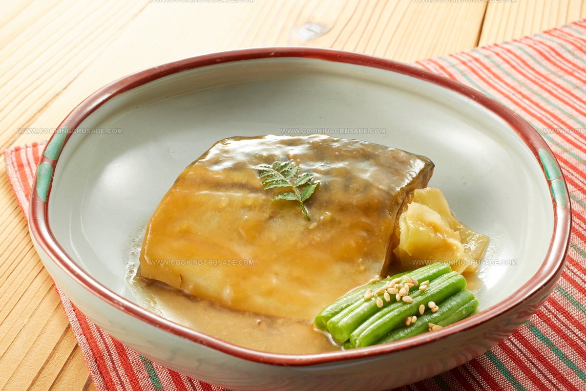 Mackerel fillets simmer gently in a complex sauce blending sake, soy sauce, mirin, and miso, creating layers of depth and richness.