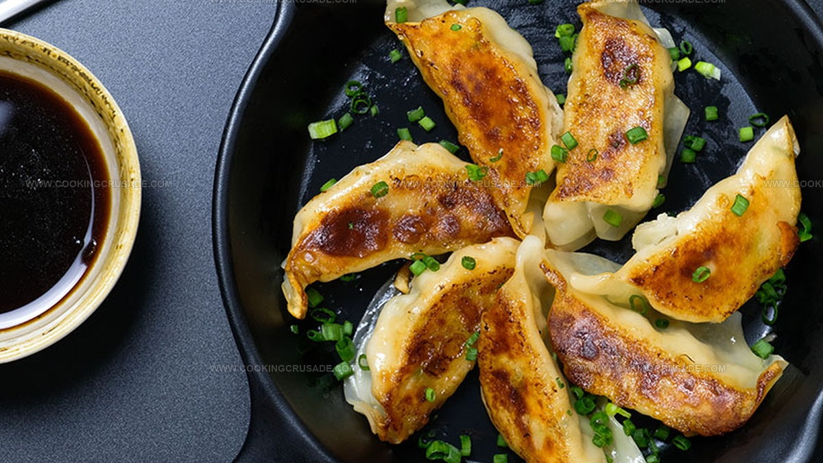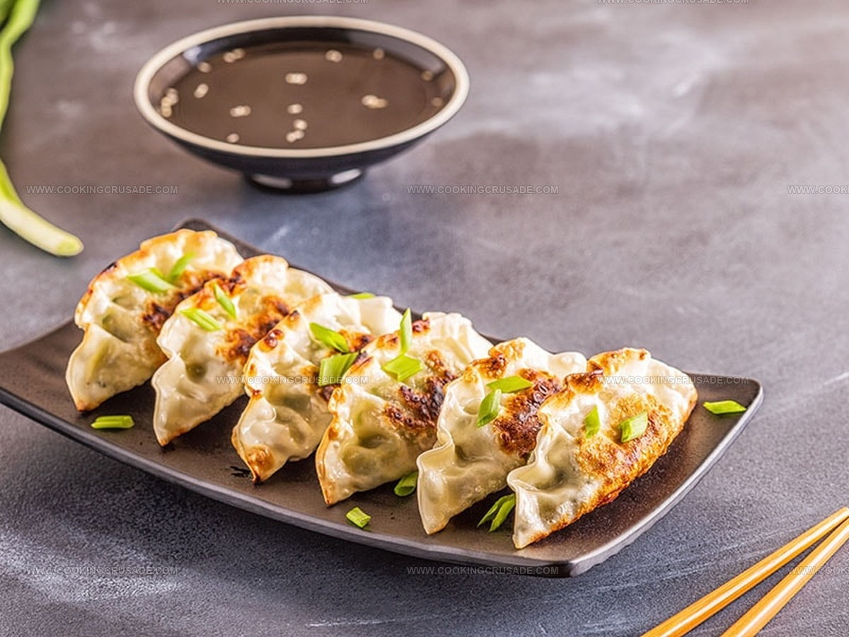 Japanese Gyoza: Pan-fried to have crispy bottoms and tender tops, typically filled with pork, garlic, and cabbage, served with a soy-based dipping sauce.