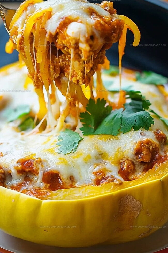 Each forkful delivers a harmonious blend of spicy enchilada sauce, succulent chicken, and creamy cheese nestled within delicate squash strands.