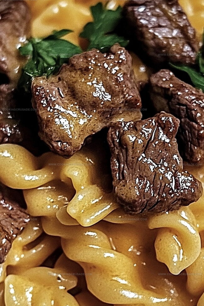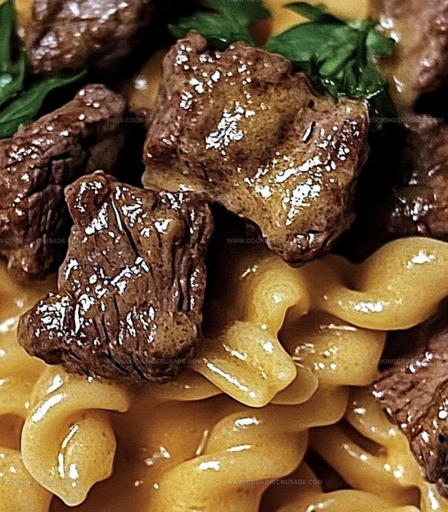 Tumble the pasta into the cheese sauce, coating each twirl completely. Gently fold in the steak bites, allowing them to get cozy with the cheesy goodness. For an extra pop of flavor, sprinkle fresh parsley and crushed red pepper flakes on top. Serve immediately and watch everyone’s eyes light up!