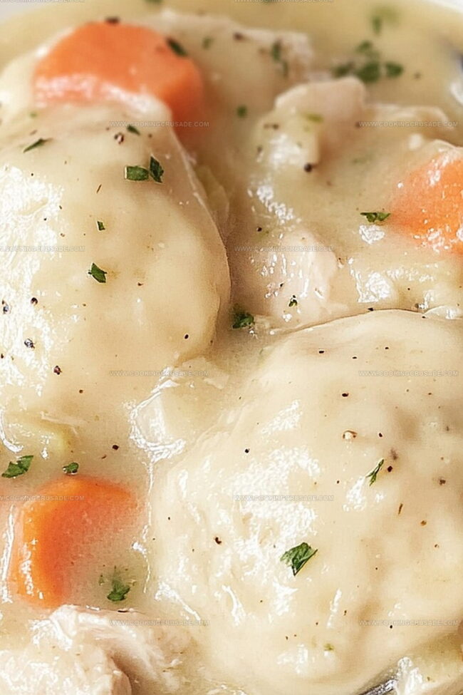 Tender chicken pieces swim alongside pillowy dumplings in a rich, creamy broth.