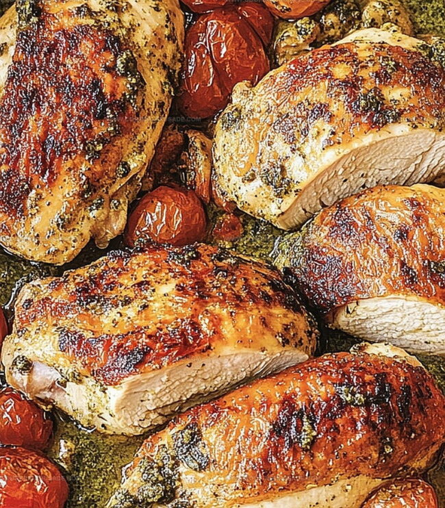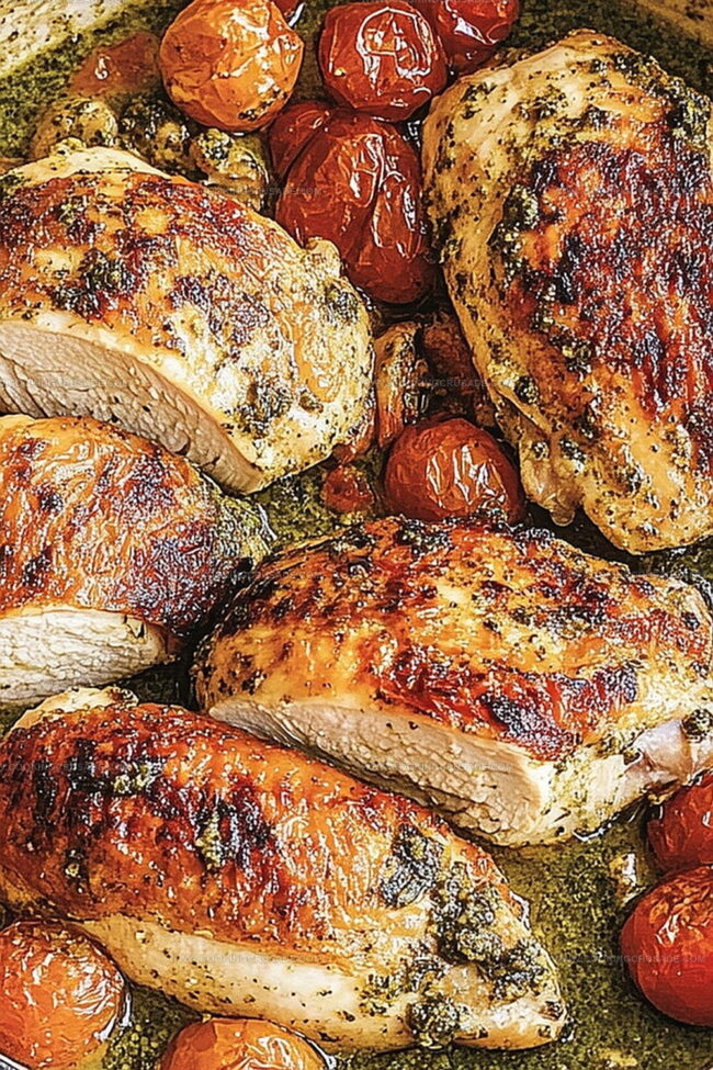 Succulent “Creamy Pesto Chicken with Roasted Tomatoes” combines Italian flavors in a simple, elegant dish. Rich basil sauce and caramelized tomatoes create a Mediterranean-inspired meal that delights palates and brings comfort to your dinner table.