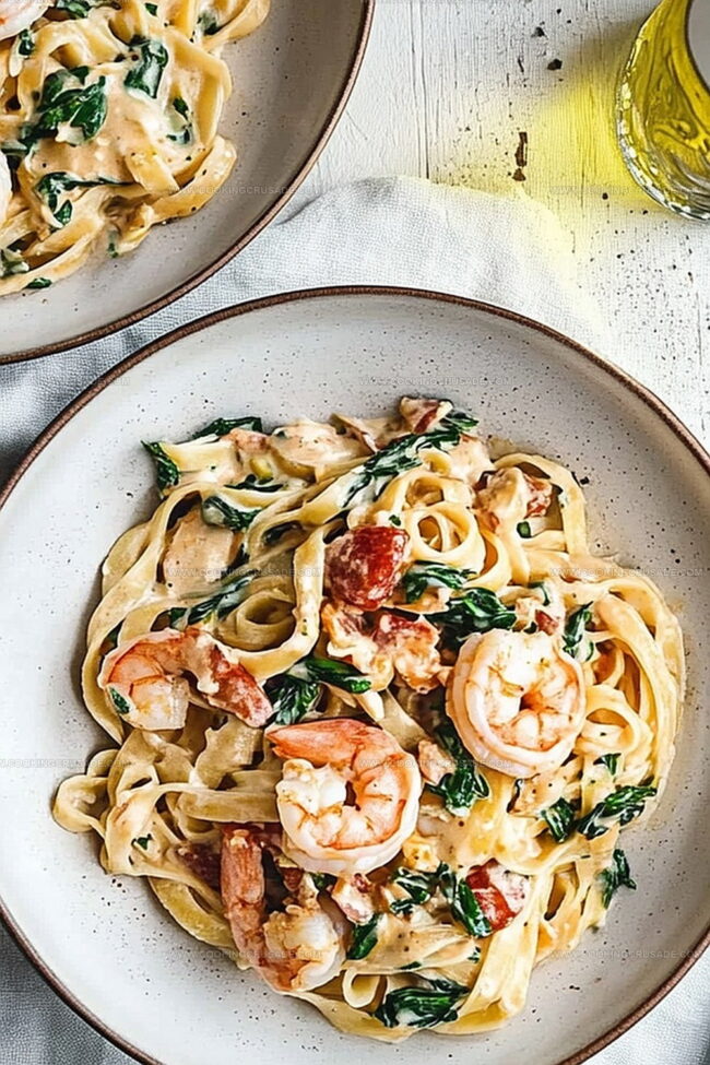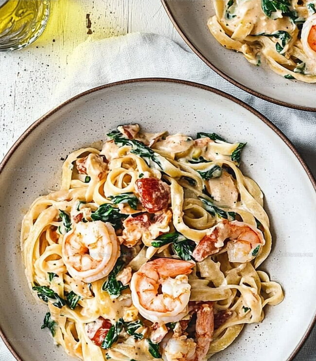 Divide the creamy, seafood-loaded pasta onto plates. Shower each serving with an extra sprinkle of Parmesan and a few twists of black pepper. Serve right away while it’s steaming hot and irresistibly delicious.