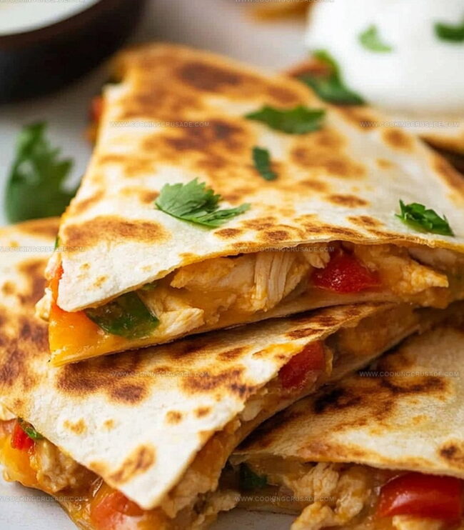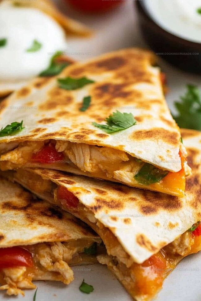Tender, seasoned chicken nestles between layers of tortillas, creating a perfect handheld meal.