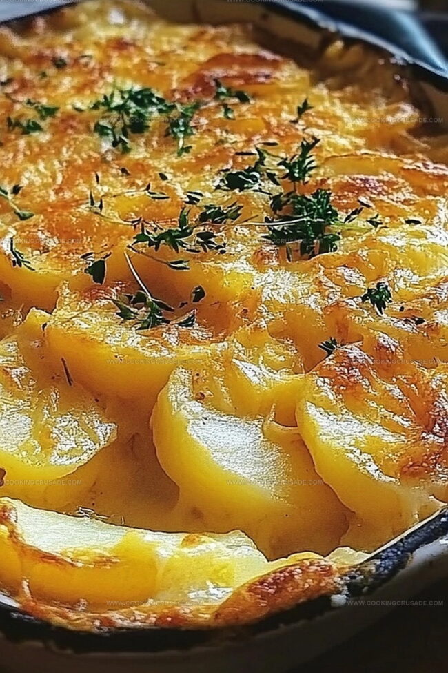 Thinly sliced potatoes absorb the decadent sauce, developing deep flavors during slow baking.