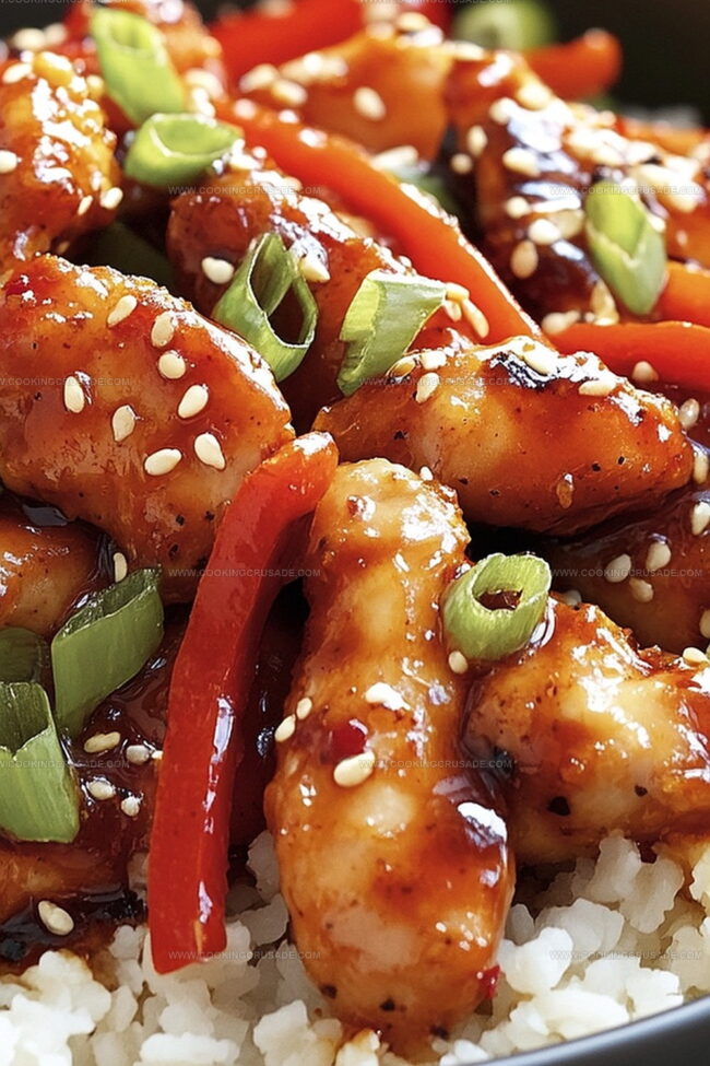 - Final Assembly: Immerse crispy chicken pieces into the vibrant sauce, meticulously tossing to ensure comprehensive and uniform glaze coverage. Garnish with freshly chopped green onions and toasted sesame seeds, then serve immediately to preserve the chicken’s tantalizing crunch and warmth.