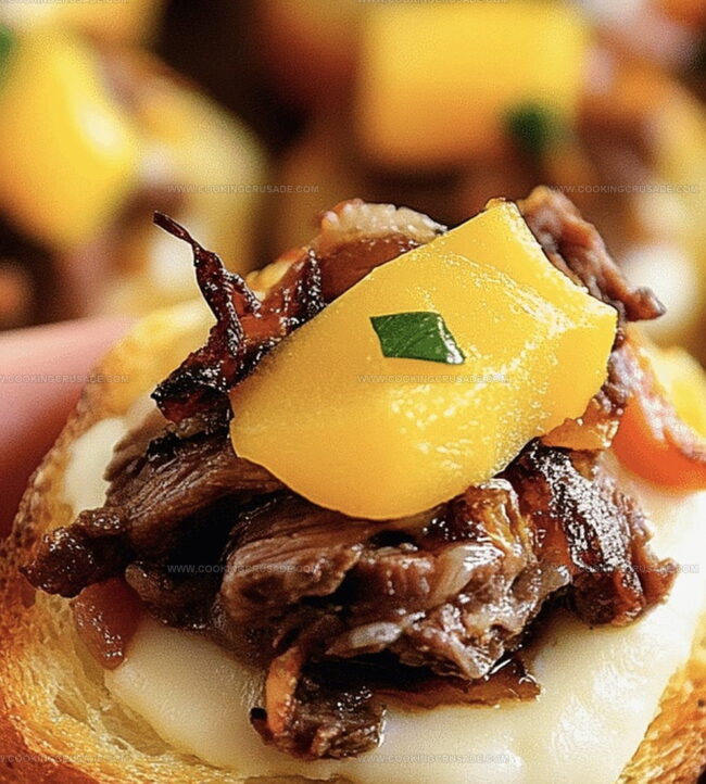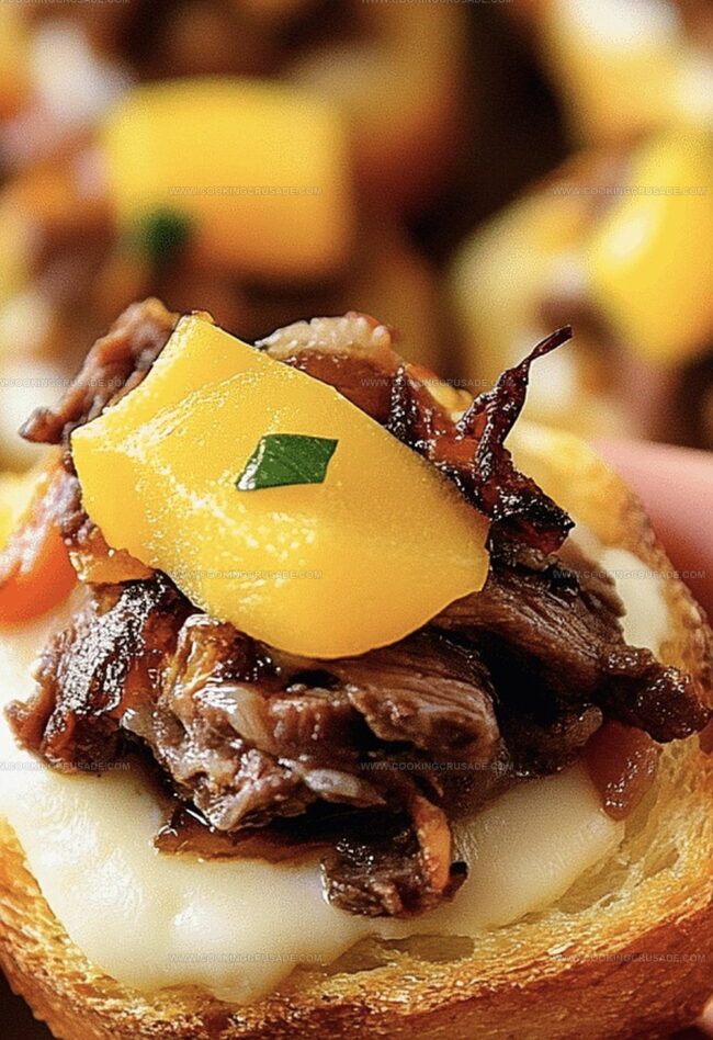 Succulent Italian beef crostini delights diners with robust Mediterranean flavors. Crisp bread layers complement rich meat, creating an elegant appetizer perfect for intimate gatherings and sophisticated palates.