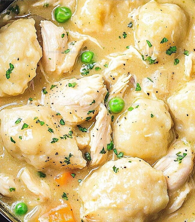 Tender chicken melts into a rich, creamy broth that hugs each tender dumpling with incredible depth.