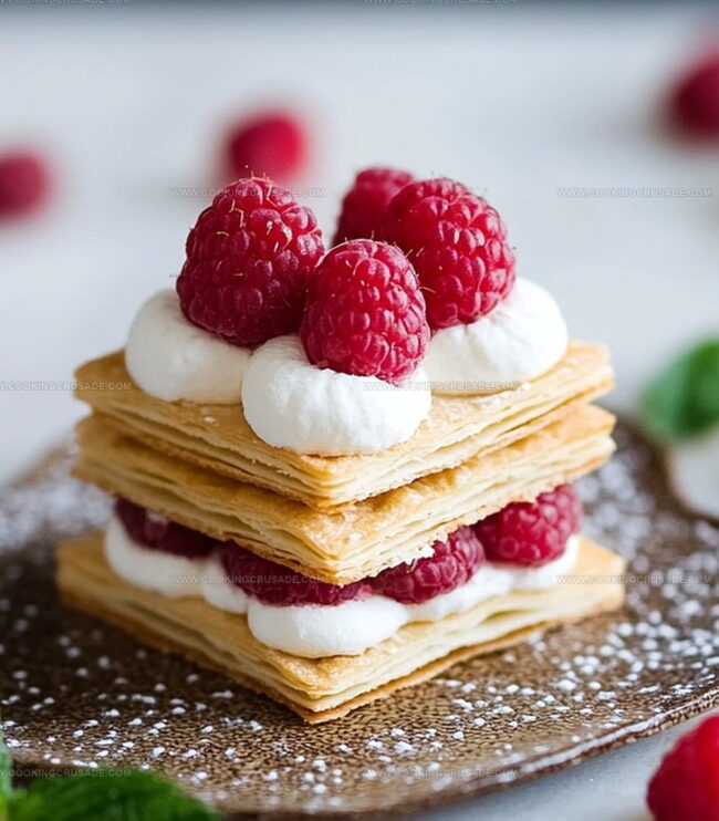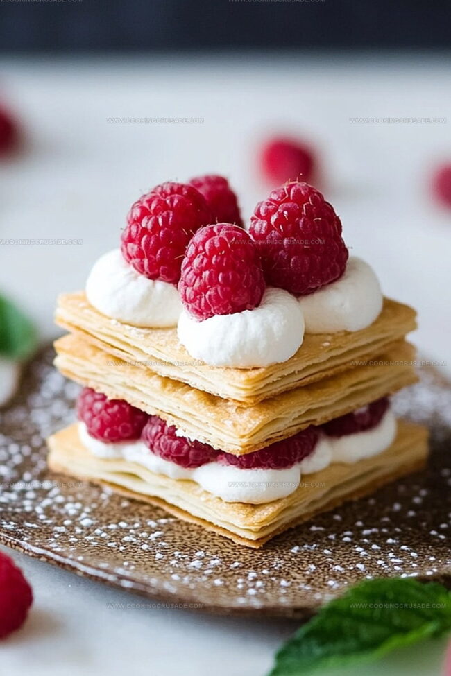 - Final Assembly: Stack additional pastry rectangles, repeating jam and cream layers. Dust with a light coating of powdered sugar and garnish with fresh raspberries for a vibrant finish.