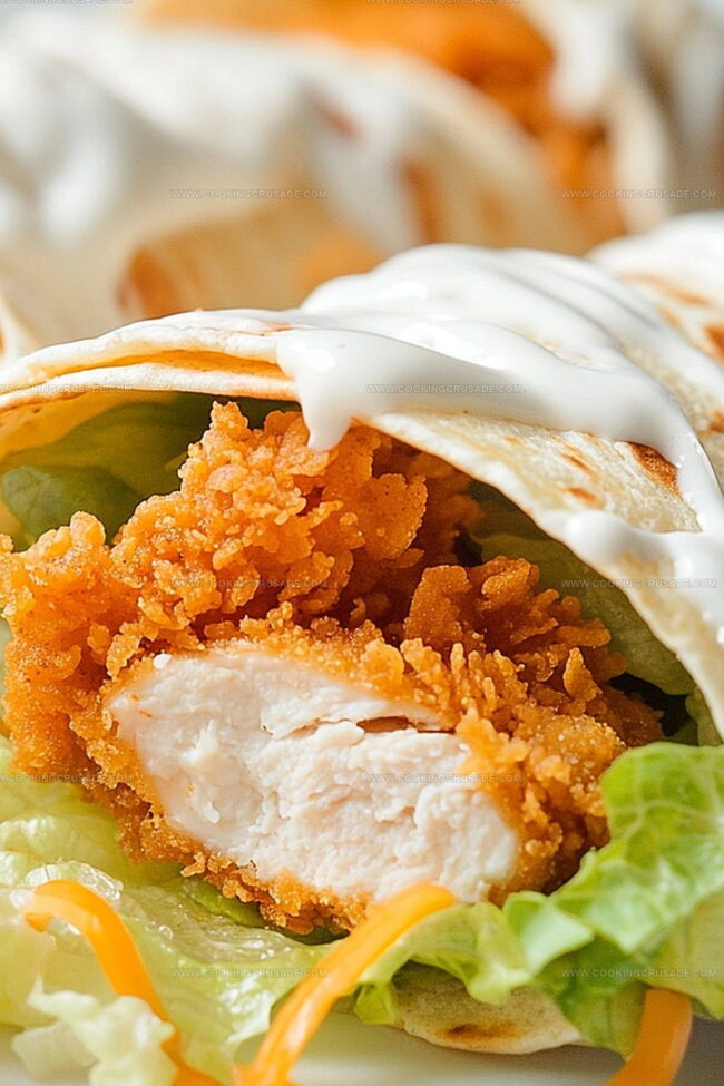 Place the hot crispy chicken right in the center of your tortilla. Sprinkle some cheese that melts like magic. Toss on fresh, crisp lettuce. Then drizzle that creamy ranch dressing to bring everything together with a zesty punch.