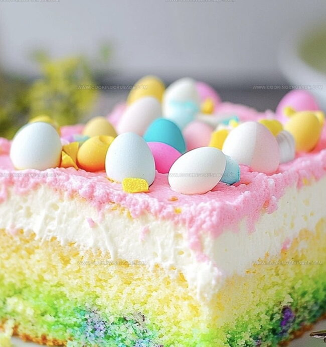 Cover the entire cake with a fluffy white topping, spreading it evenly. Sprinkle pastel candies and decorative Easter-themed sprinkles across the surface. Chill the cake in the refrigerator for at least an hour to let all the flavors meld together. The longer it chills, the more delicious it becomes.