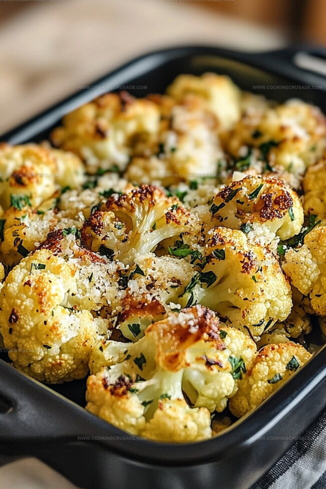 Once your cauliflower emerges golden and crisp, shower it with freshly grated parmesan cheese. Gently toss to allow the warm vegetable to melt the cheese slightly. Sprinkle some chopped fresh parsley on top for a burst of color and freshness. Serve immediately while still warm and irresistibly crispy.