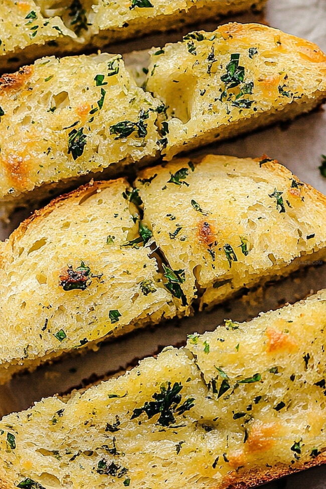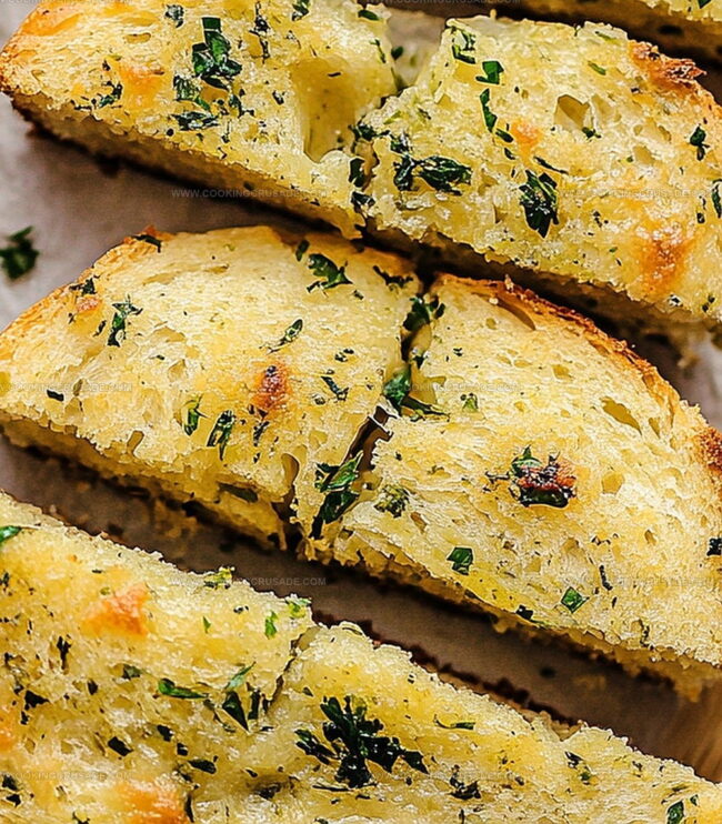 Warm, golden slices of garlic bread with crispy garlic bread edges invite comfort and nostalgia at every bite.