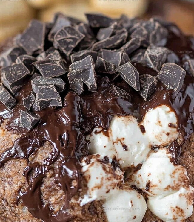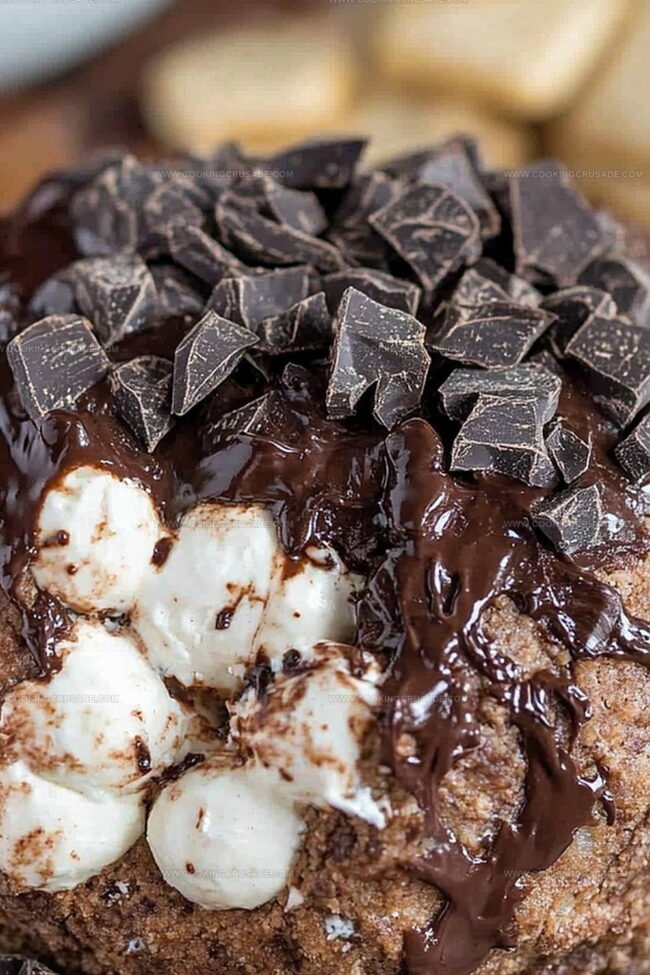 Chocolate s’mores cheeseball blends campfire nostalgia with creamy indulgence from classic graham cracker desserts. Chocolate graham crumbs and marshmallow bits create a sweet party appetizer perfect for gatherings and dessert tables.