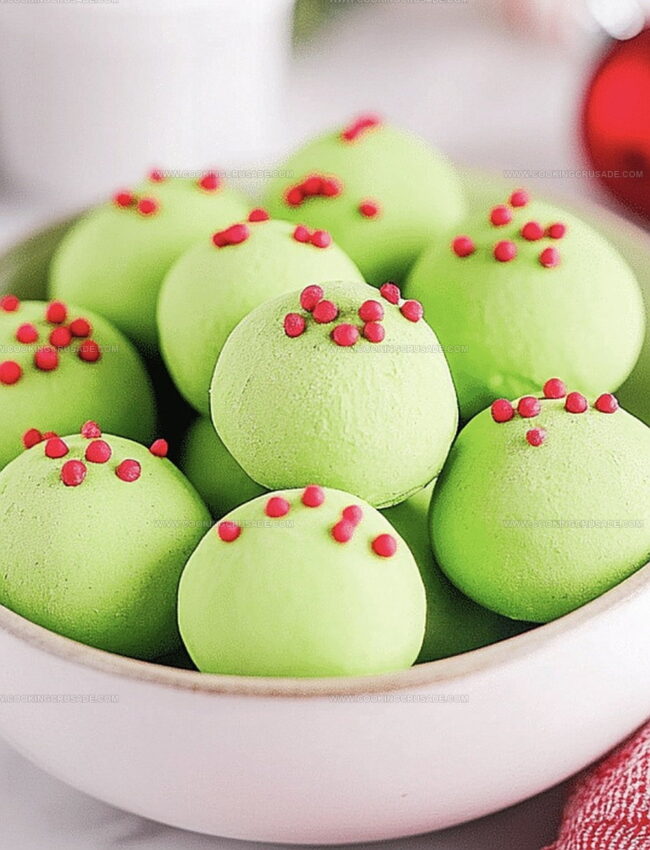 Festive Christmas Grinch Truffles bring whimsical holiday cheer with green-tinted white chocolate coating and playful red heart sprinkles. Sweet chocolate centers and creamy textures make these treats perfect for sparkling seasonal celebrations you’ll absolutely adore.