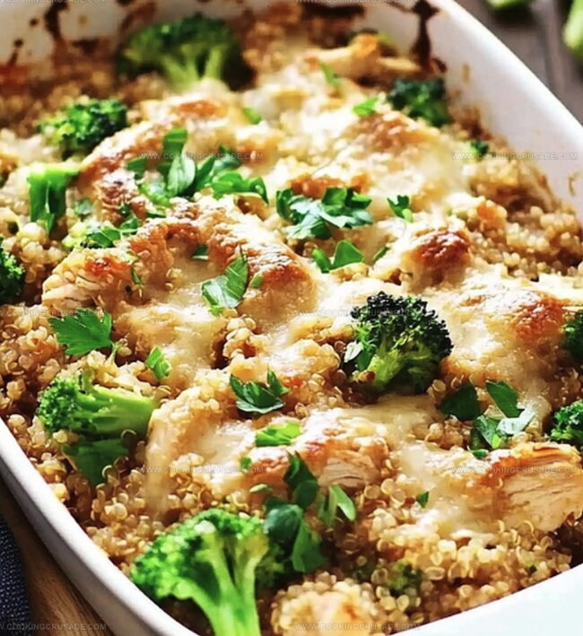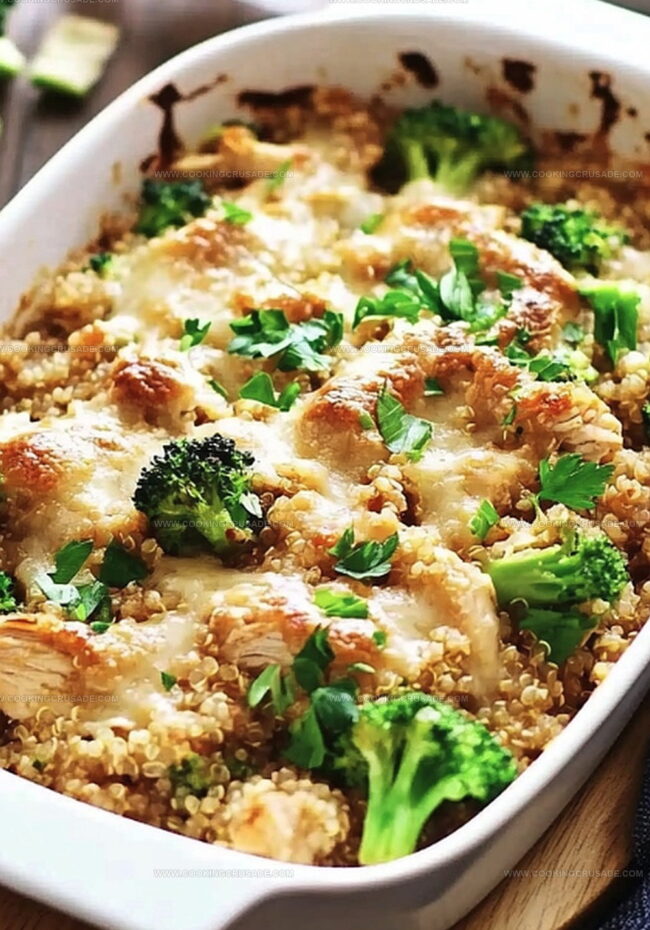 The casserole blends tender chicken, nutrient-dense quinoa, and vibrant broccoli into a one-dish wonder.