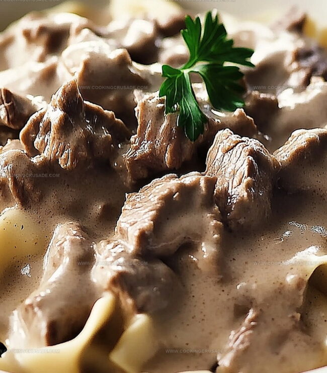 Classic beef stroganoff simmers with tender meat and creamy sauce in this hearty crock pot meal. Rich Russian-inspired flavors meld together, creating a comforting dinner you’ll savor with each delicious bite.