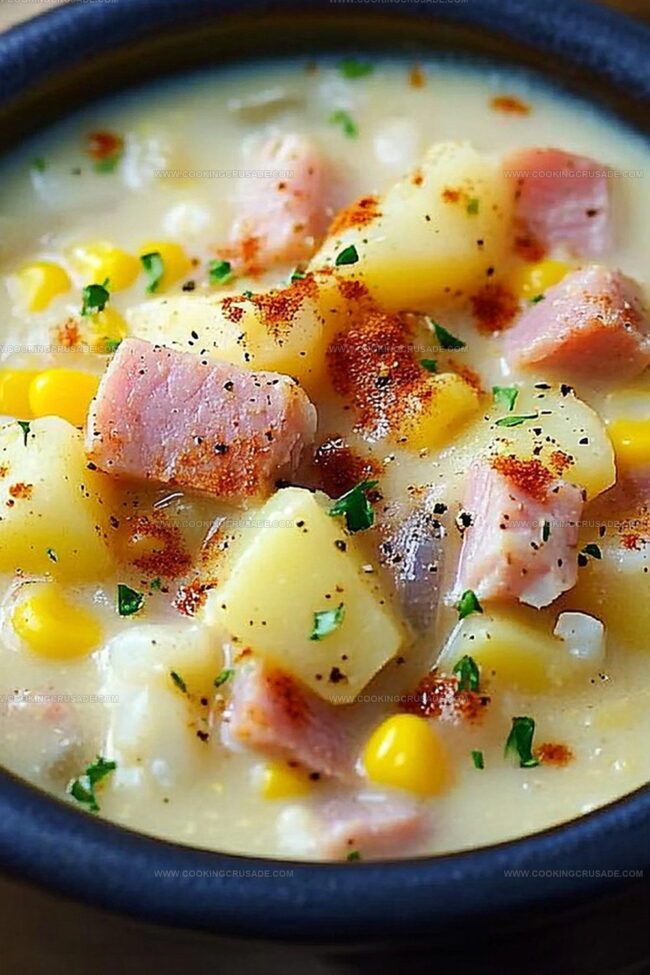Comfort calls with this rich ham and potato corn chowder that promises warmth in every spoonful.