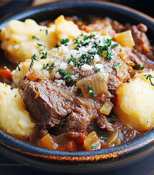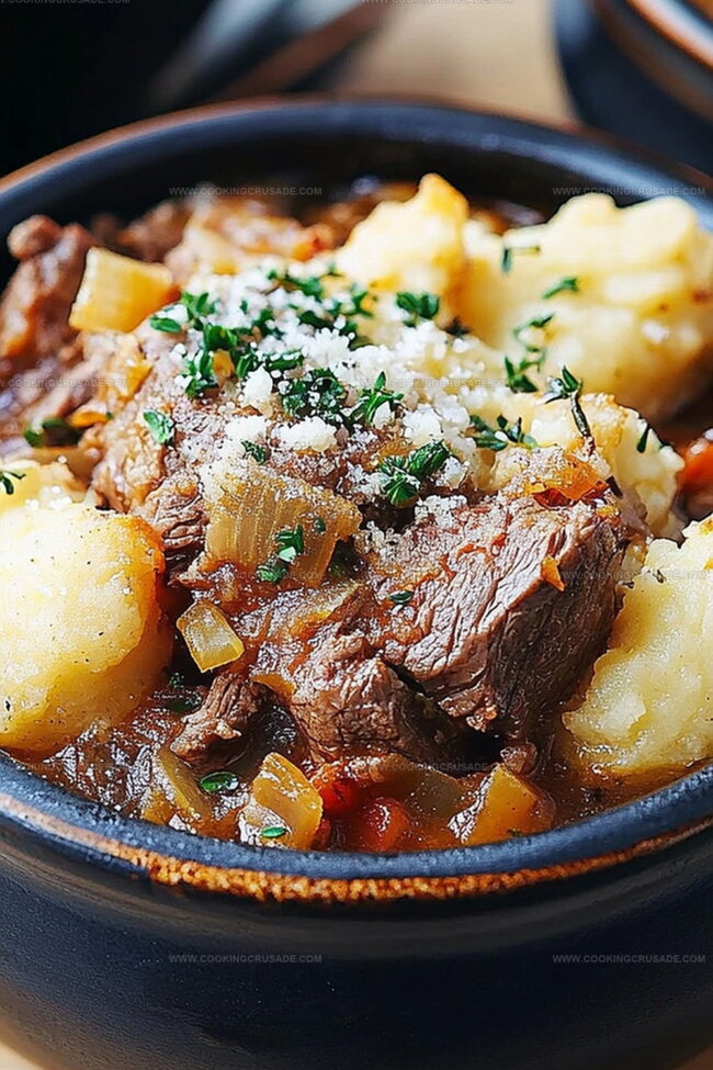 Chunky vegetables nestle between succulent beef pieces, creating a rustic and comforting dish.