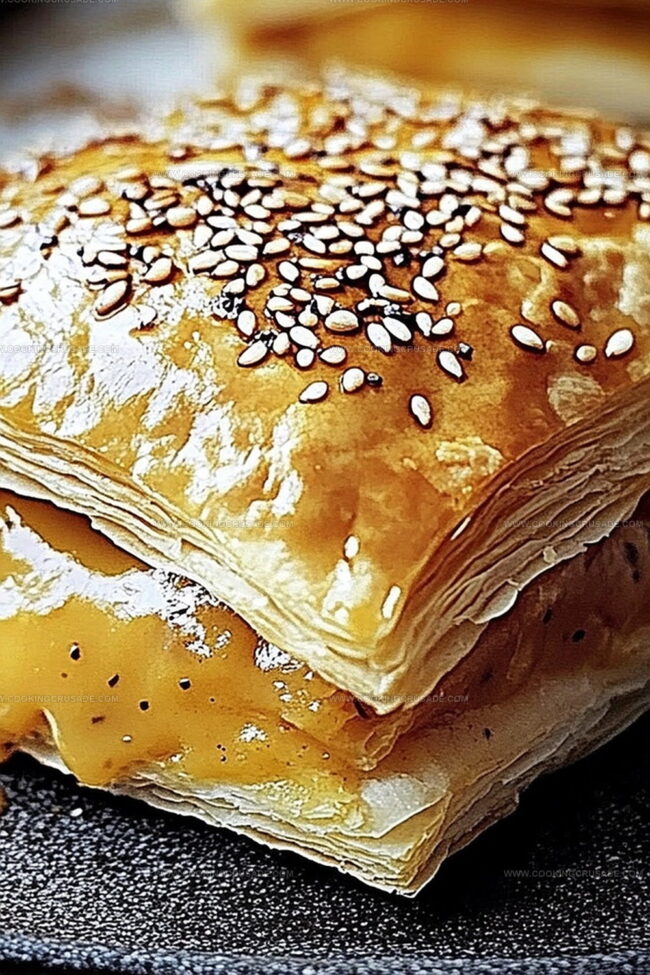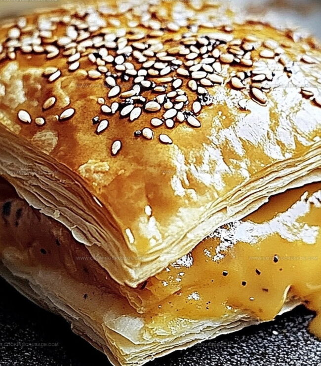 Spoon a generous dollop of the egg mixture right into the center of each pastry square. Now for the fun part – carefully fold the corners toward the middle, creating a beautiful rustic pocket. Leave a small peek of the filling visible for that mouthwatering appeal. Brush the edges with a quick egg wash (whisk an egg with a splash of water) and sprinkle with sesame or poppy seeds if you’re feeling fancy.