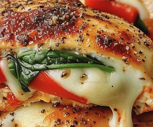 Succulent chicken breasts become a canvas for a vibrant stuffed delight featuring roasted red pepper, spinach, and mozzarella that promises pure culinary excitement.
