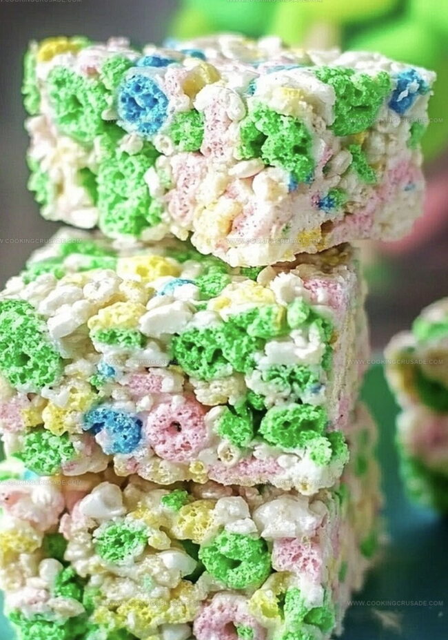 - Serving: Once cooled and solidified, slice into uniform squares, revealing the vibrant Lucky Charms marshmallow pieces throughout the treats, and serve immediately.