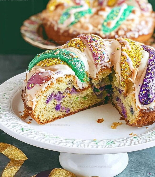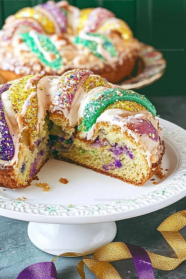 - Cascade the glossy glaze over the cooled cake, then embellish with traditional Mardi Gras-colored sugars in vibrant green, regal purple, and festive gold.