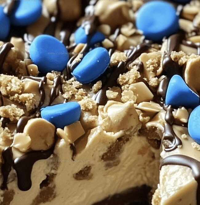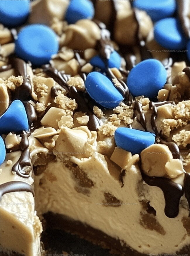 Pull out your masterpiece, slice it up, and prepare for a flavor explosion. Each bite promises a perfect blend of creamy cheesecake, peanut butter, and playful cookie crunch!