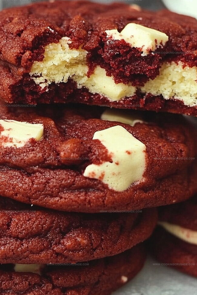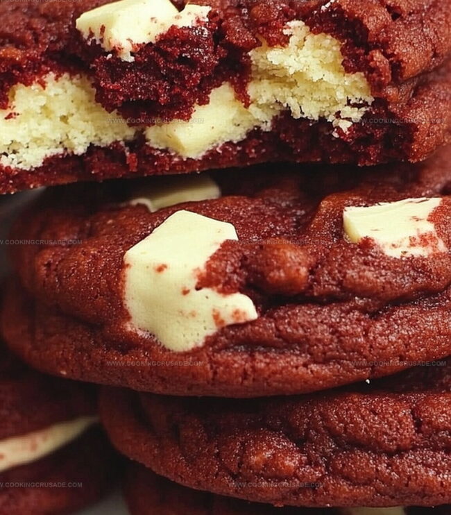 Chocolate Accent: – White Chocolate Chips: Creates creamy contrast against red cookie base. High-quality chips recommended for best melting.