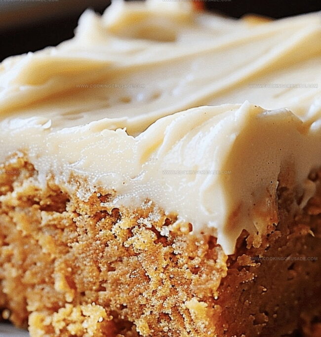 - Once the pumpkin bars have reached room temperature, generously spread the cream cheese frosting across the entire surface.