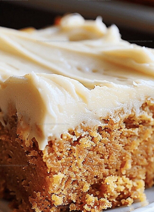- Slice into squares and serve, revealing the moist, spice-infused layers beneath the creamy topping.