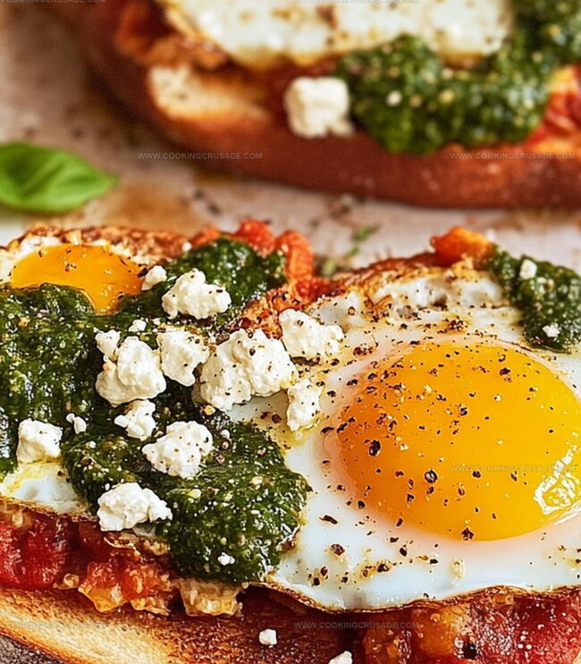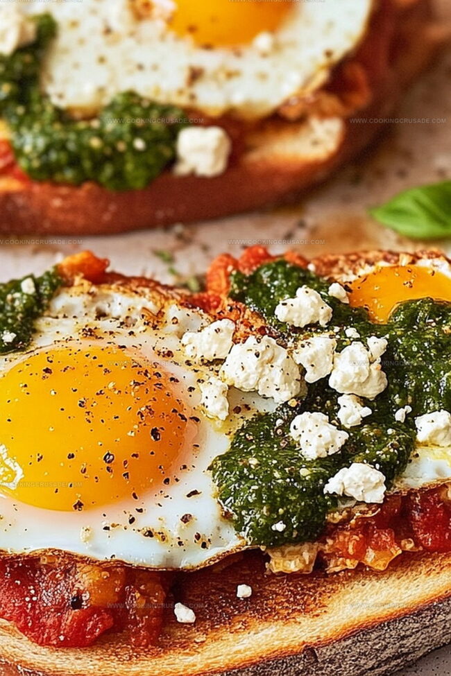 - Crown each toast with the feta-nestled fried egg, then garnish with additional crumbled feta, fresh herbs, and a sprinkle of red pepper flakes or sumac for an extra flavor dimension.