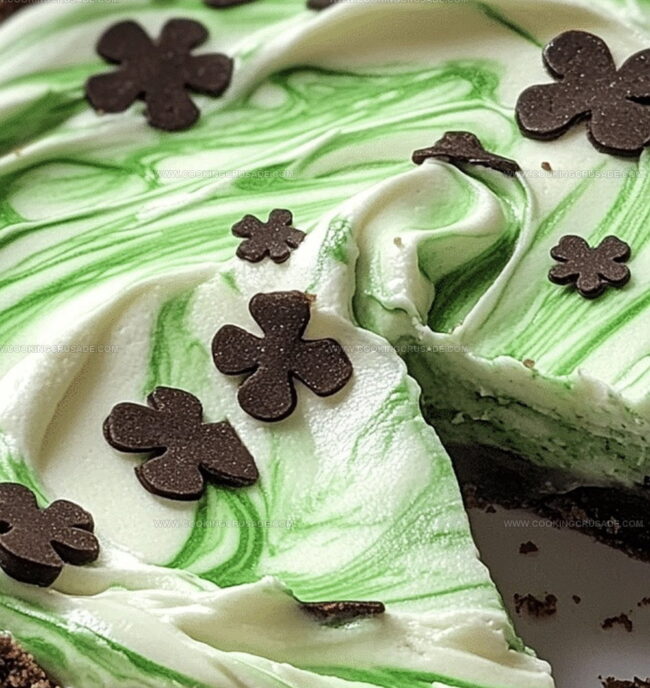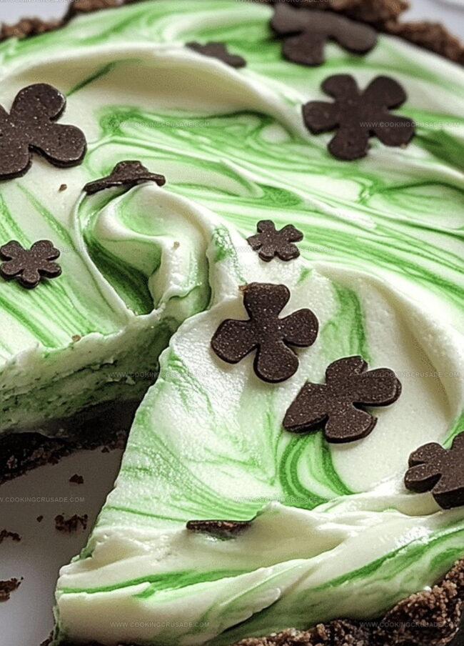 The pie combines classic cheesecake flavors with a festive green swirl, creating a visually stunning and delicious dessert perfect for St. Patrick’s Day or any celebration.