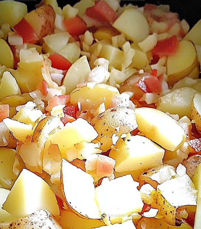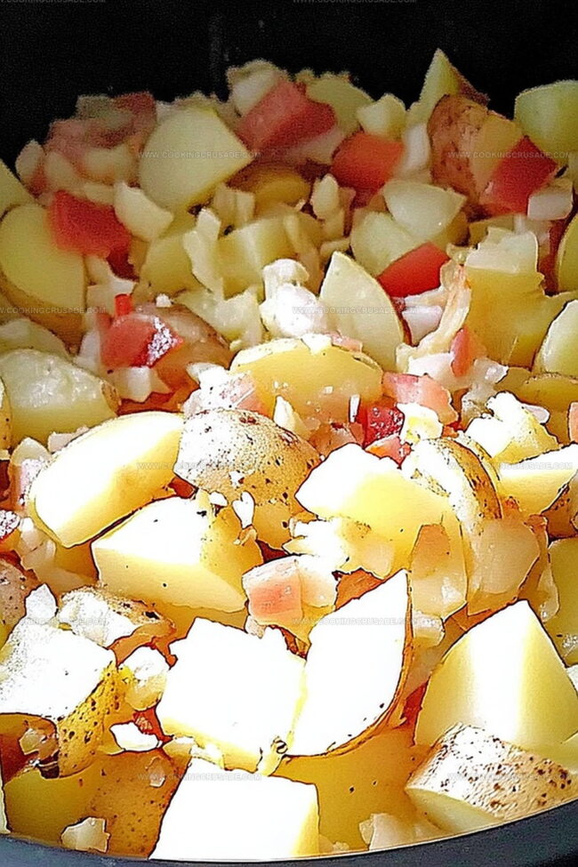 - Layer diced potatoes systematically over the meat, ensuring complete coverage and uniform distribution across the cooking surface.