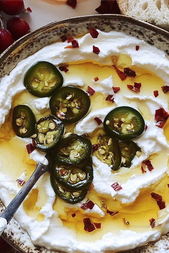- Presentation: Artfully transfer the whipped ricotta to a serving bowl, using a spatula to create elegant surface swirls and garnish with additional finely chopped jalapeno pieces for visual and textural interest.
