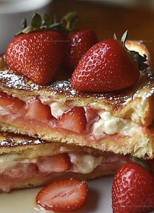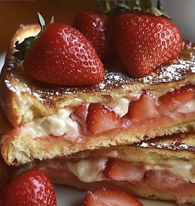 Thick challah bread transforms into a canvas for rich cream cheese and vibrant strawberry filling.