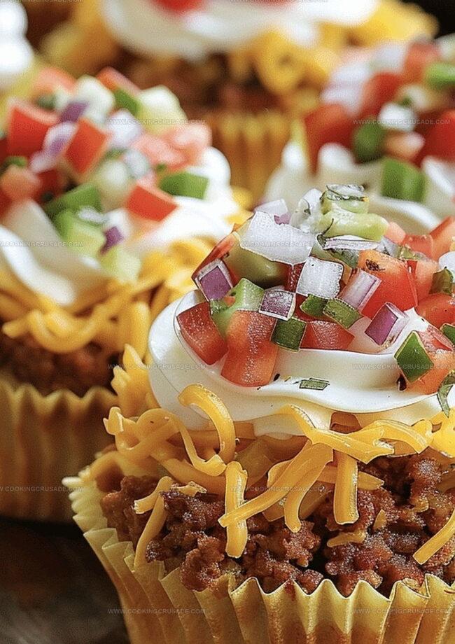 Pull out your gorgeous taco cupcake towers and let them rest briefly. Customize with delightful toppings:Enjoy your crispy, flavor-packed taco cupcake adventure!