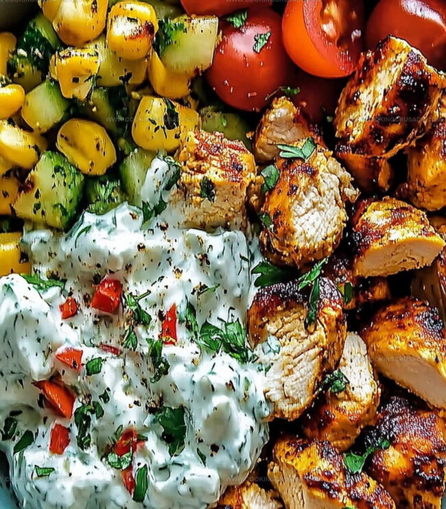 Layer a bed of fluffy rice or quinoa. Top with sliced chicken, generously dollop tzatziki sauce, sprinkle chopped fresh herbs, and add a handful of crisp cucumber chunks.