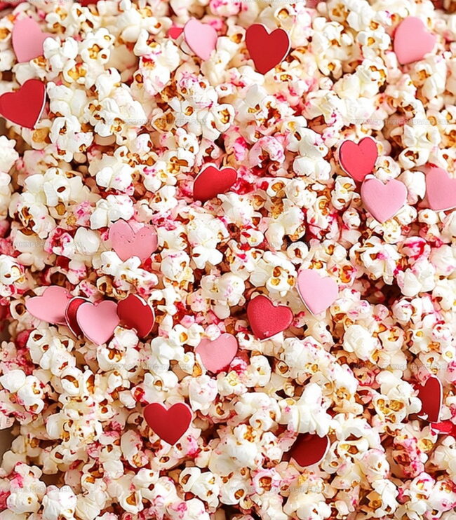 This sweet treat combines crunchy popcorn with romantic colors and festive toppings, making it perfect for Valentine’s Day parties, gifts, or simple romantic moments.