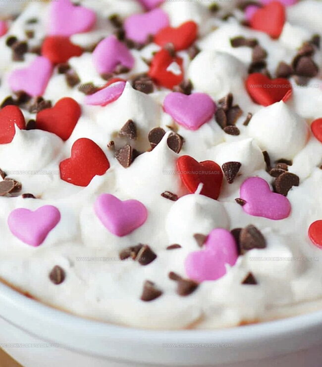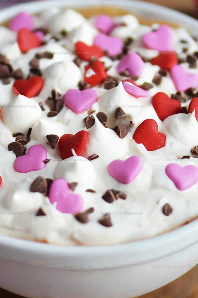- For a festive Valentine’s Day presentation, serve the dip in a heart-shaped bowl or garnish with red sprinkles and chocolate shavings to create a romantic touch.