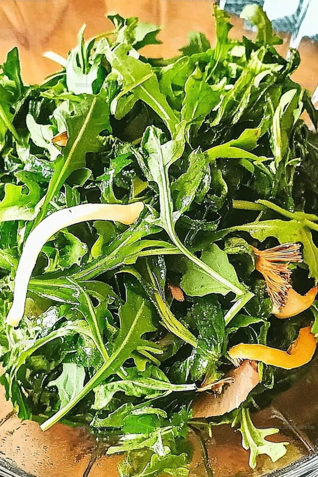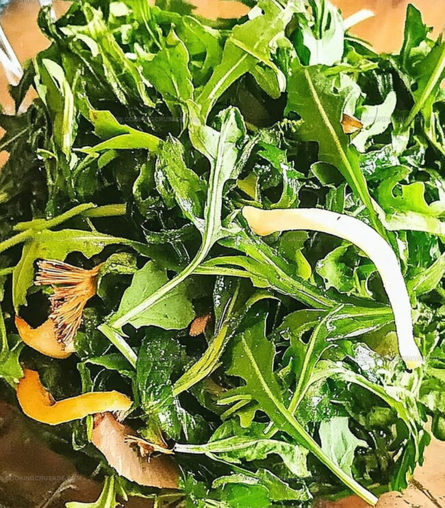 The salad pairs beautifully with a zesty lemon vinaigrette that balances the greens’ natural intensity.